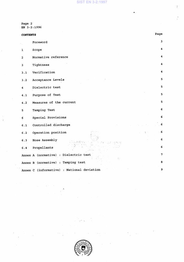 EN 3-2:1996 is a standard published by the European Committee for Standardization (CEN). Its full title is "Portable fire extinguishers - Part 2: Tightness, dielectric test, tamping test, special provisions". This standard covers: This standard specifies the tightness, the dielectric test, the tamping test and special provisions applicable to portable fire extinguisher.