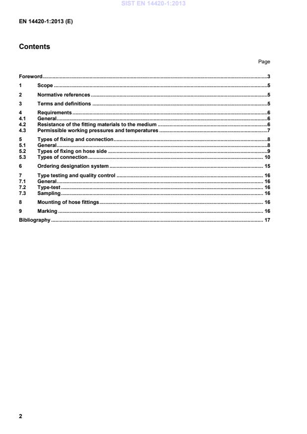 For maximum working pressure (WP) and temperature see 4.3. WARNING — Before decoupling of the quick coupling connections according to Parts 6, 7 and 8, the assembly should be at atmospheric pressure. 2 Normative references The following documents, in whole or in part, are normatively referenced in this document and are indispensable for its application. For dated references, only the edition cited applies. For undated references, the latest edition of the referenced document (including any amendments) applies. EN 10204, Metallic products — Types of inspection documents EN 14420-2, Hose fittings with clamp units — Part 2: Hose side parts of hose tail EN 14420-3, Hose fittings with clamp units — Part 3: Clamp units, bolted or pinned EN 14420-4, Hose fittings with clamp units — Part 4: Flange connections EN 14420-5, Hose fittings with clamp units — Part 5: Threaded connections EN 14420-6, Hose fittings with clamp units — Part 6: TW tank truck couplings EN 14420-7, Hose fittings with clamp units — Part 7: Cam locking couplings EN 14420-8, Hose fittings with clamp units — Part 8: Symmetrical half coupling (Guillemin system) EN ISO 228-1, Pipe threads where pressure-tight joints are not made on the threads — Part 1: Dimensions, tolerances and designation (ISO 228-1) EN ISO 8330:2008, Rubber and plastics hoses and hose assemblies — Vocabulary (ISO 8330:2007) ISO 2859-1, Sampling procedures for inspection by attributes — Part 1: Sampling schemes indexed by acceptance quality limit (AQL) for lot-by-lot inspection 3 Terms and definitions For the purposes of this document, the terms and definitions given in EN ISO 8330:2008 and the following apply. 3.1 DN (nominal size) alphanumeric designation of size for components of a pipework system, which is used for reference purposes. It comprises the letters DN followed by a dimensionless whole number which is indirectly related to the physical size, in millimetres, of the bore or outside diameter of the end connections Note 1 to entry: The number following the letters DN does not represent a measurable value and should not be used for calculation purposes except where specified in the relevant standard. SIST EN 14420-1:2013