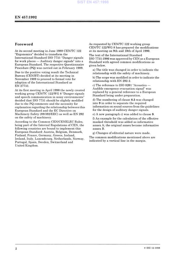 EN 457:1992 is a standard published by the European Committee for Standardization (CEN). Its full title is "Safety of machinery - Auditory danger signals - General requirements, design and testing (ISO 7731:1986, modified)". This standard covers: This European Standard specifies the safety and ergonomic requirements and the corresponding test methods for auditory danger signals and gives guidelines for the design of the signal to be clearly perceived and differentiated as required in 5.3 of EN 292-2. This European Standard does not apply to verbal danger warnings (e.g. shouts, loudspeaker announcements). Special regulations such as those for a public disaster and public transport are not effected by this European Standard.