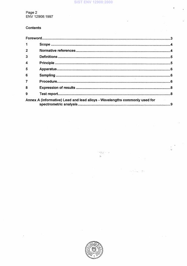 ENV 12908:1997 is a standardization document published by the European Committee for Standardization (CEN). Its full title is "Lead and lead alloys - Analysis by Optical Emission Spectrometry (OES) with spark excitation". This standard covers: This prestandard specifies the method for the analysis of lead and lead alloys by Optical Emission Spectrometry (OES) with spark excitation. The method is applicable to the elements and ranges given in table 1.