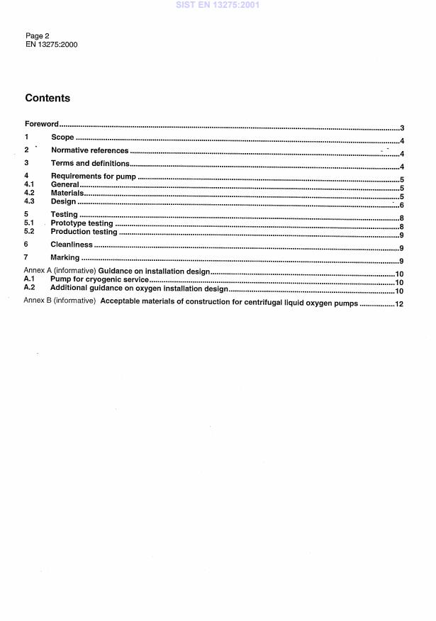 EN 13275:2000 is a standard published by the European Committee for Standardization (CEN). Its full title is "Cryogenic vessels - Pumps for cryogenic service". This standard covers: This standard specifies the minimum requirements for the design, manufacture and testing of pumps for cryogenic service (i.e. for operation with cryogenic fluids below -10°C). This standard covers centrifugal pumps. However the principles may be applied to other types of pumps (e.g. reciprocating). This standard also gives guidance on the design of installations. (See annex A). It does not specify requirements on operation or maintenance.