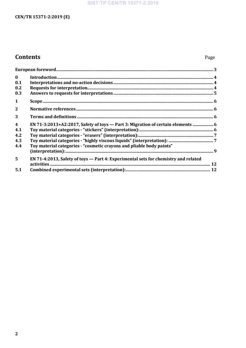 CEN/TR 15371-2:2019 is a technical report published by the European Committee for Standardization (CEN). Its full title is "Safety of toys - Interpretations - Part 2: Replies to requests for interpretation of the chemical standards in the EN 71-series". This standard covers: The purpose of this document is to provide replies to requests for interpretations of actual chemical standards in the EN 71 series: - EN 71-3: Migration of certain elements; - EN 71-4: Experimental sets for chemistry and related activities; - EN 71-5: Chemical toys (sets) other than experimental sets; - EN 71-7: Finger paints - Requirements and test methods; - EN 71-9: Organic chemical compounds - Requirements; - EN 71-10: Organic chemical compounds - Sample preparation and extraction; - EN 71-11: Organic chemical compounds - Methods of analysis; - EN 71-12: N-Nitrosamines and N-Nitrosatable substances; - EN 71-13: Olfactory board games, cosmetic kits and gustative games.