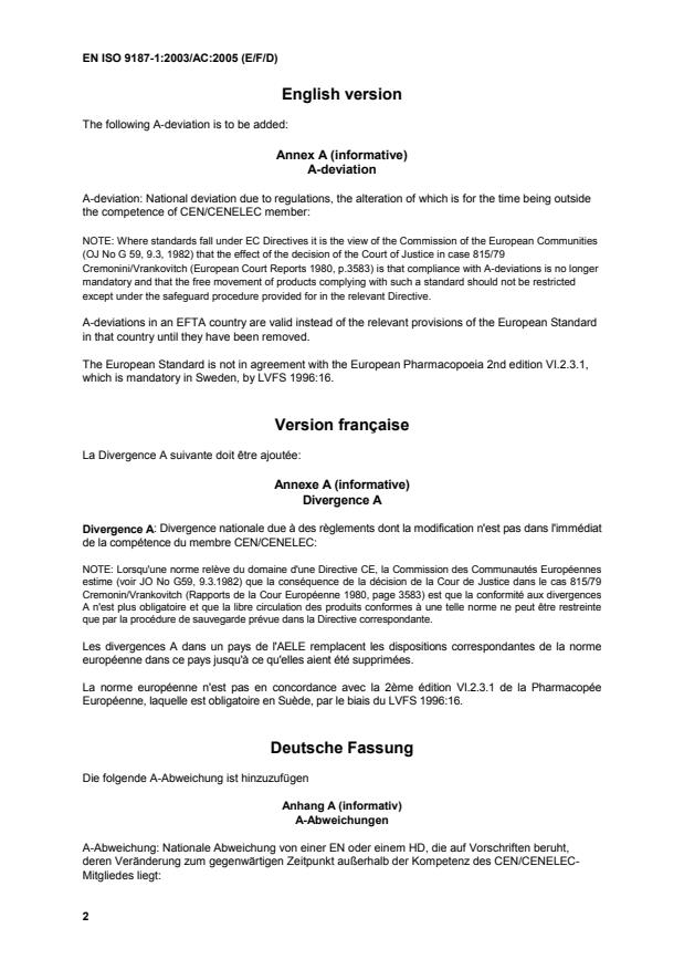 NOTE: Where standards fall under EC Directives it is the view of the Commission of the European Communities (OJ No G 59, 9.3, 1982) that the effect of the decision of the Court of Justice in case 815/79 Cremonini/Vrankovitch (European Court Reports 1980, p.3583) is that compliance with A-deviations is no longer mandator