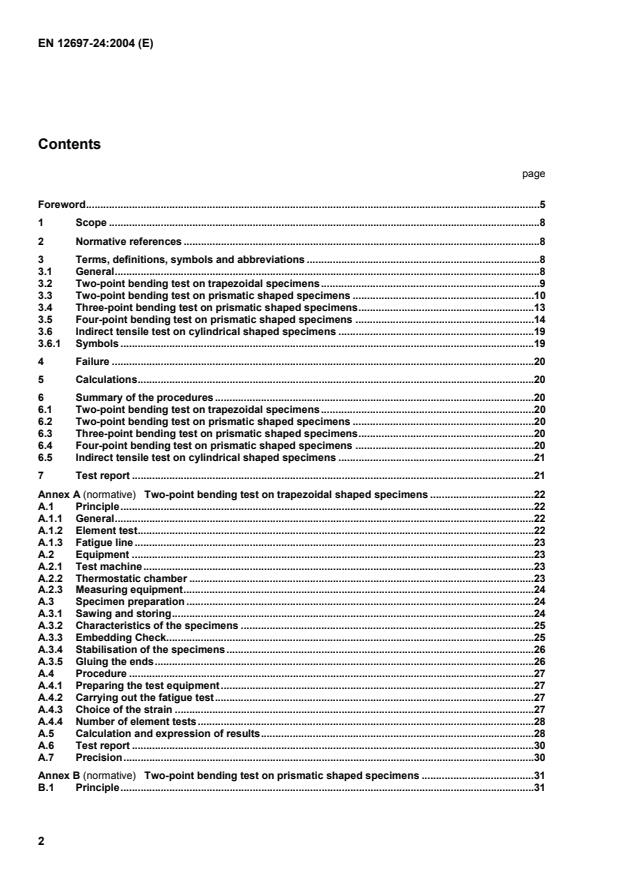 Two-point bending test on trapezoidal shaped specimens.22 A.1 Principle.22 A.1.1 General.22 A.1.2 Element test.22 A.1.3 Fatigue line.23 A.2 Equipment.23 A.2.1 Test machine.23 A.2.2 Thermostatic chamber.23 A.2.3 Measuring equipment.24 A.3 Specimen preparation.24 A.3.1 Sawing and storing.24 A.3.2 Characteristics of the specimens.25 A.3.3 Embedding Check.25 A.3.4 Stabilisation of the specimens.26 A.3.5 Gluing the ends.26 A.4 Procedure.27 A.4.1 Preparing the test equipment.27 A.4.2 Carrying out the fatigue test.27 A.4.3 Choice of the strain.27 A.4.4 Number of element tests.28 A.5 Calculation and expression of results.28 A.6 Test report.30 A.7 Precision.30 Annex B (normative)