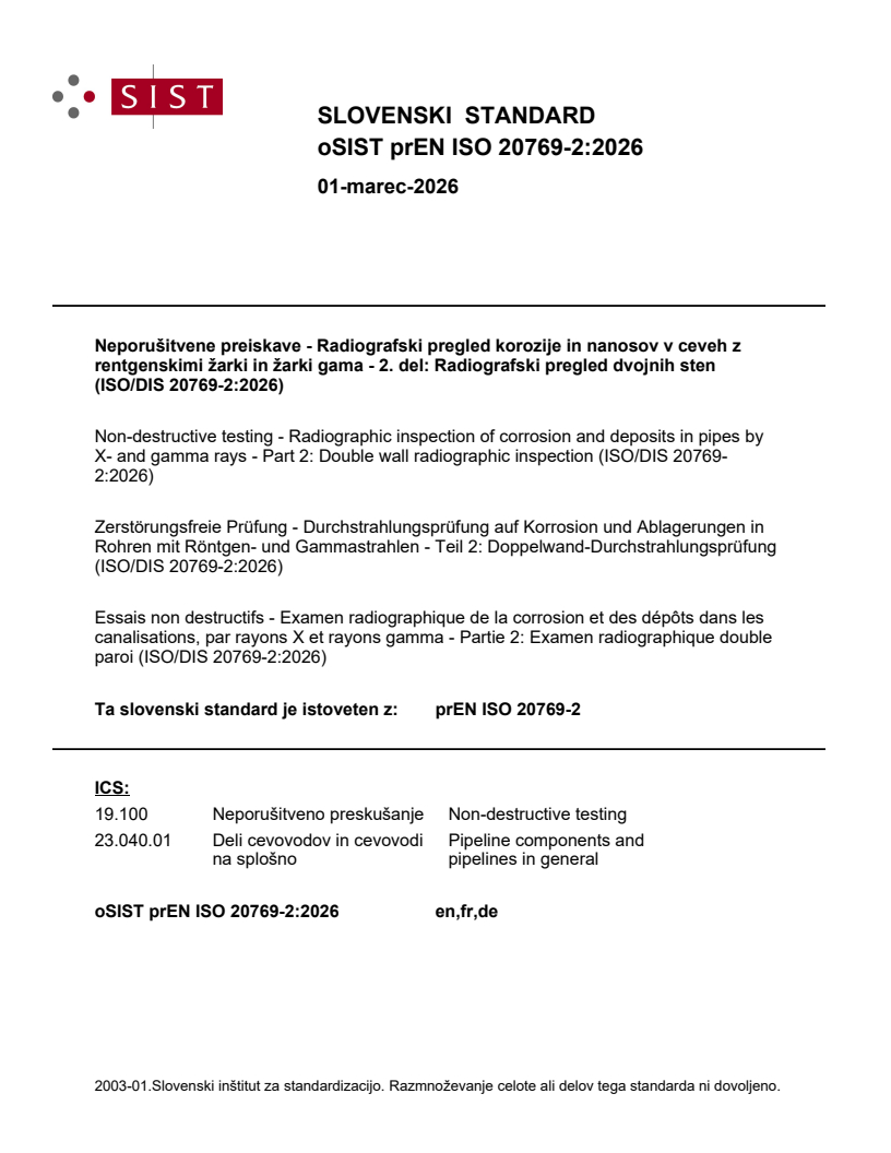 Neporušitvene preiskave - Radiografski pregled korozije in nanosov v ceveh z rentgenskimi žarki in žarki gama - 2. del: Radiografski pregled dvojnih sten (ISO/DIS 20769-2:2026)