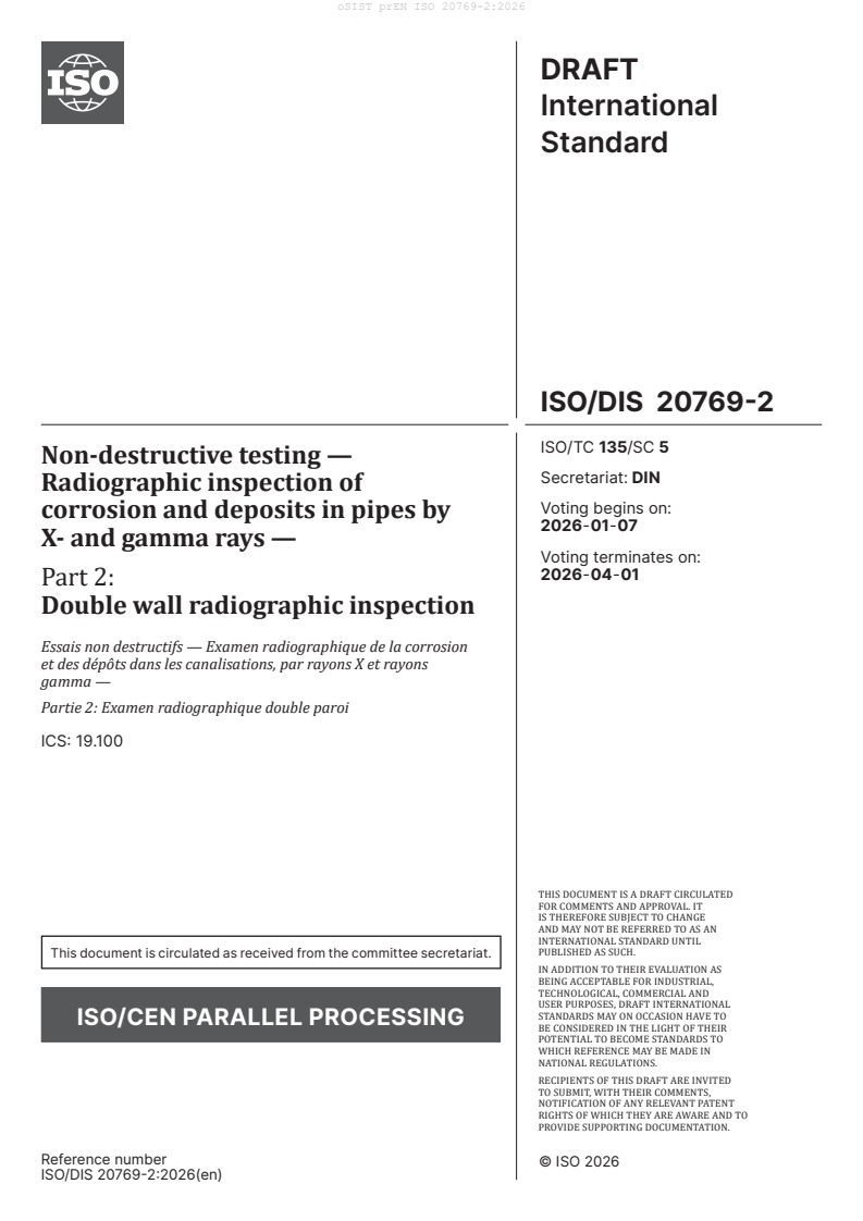 Non-destructive testing - Radiographic inspection of corrosion and deposits in pipes by X- and gamma rays - Part 2: Double wall radiographic inspection (ISO/DIS 20769-2:2026)