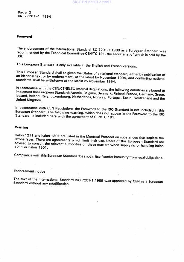 IS0 7201-1 : 1989 (E) Introduction This International Standard is one of a series giving specifications for fire extinguishing media in common use and which are in need of standardization for fire fighting pur- poses. These specifications are designed to establish that the medium in question has at least a minimum useful fire extinguishing capability and can therefore be reasonably sold for fire extinguishing purposes. Requirements for media used in particular equipment will form the subject of future International Standards. . 111 SIST EN 27201-1:1997