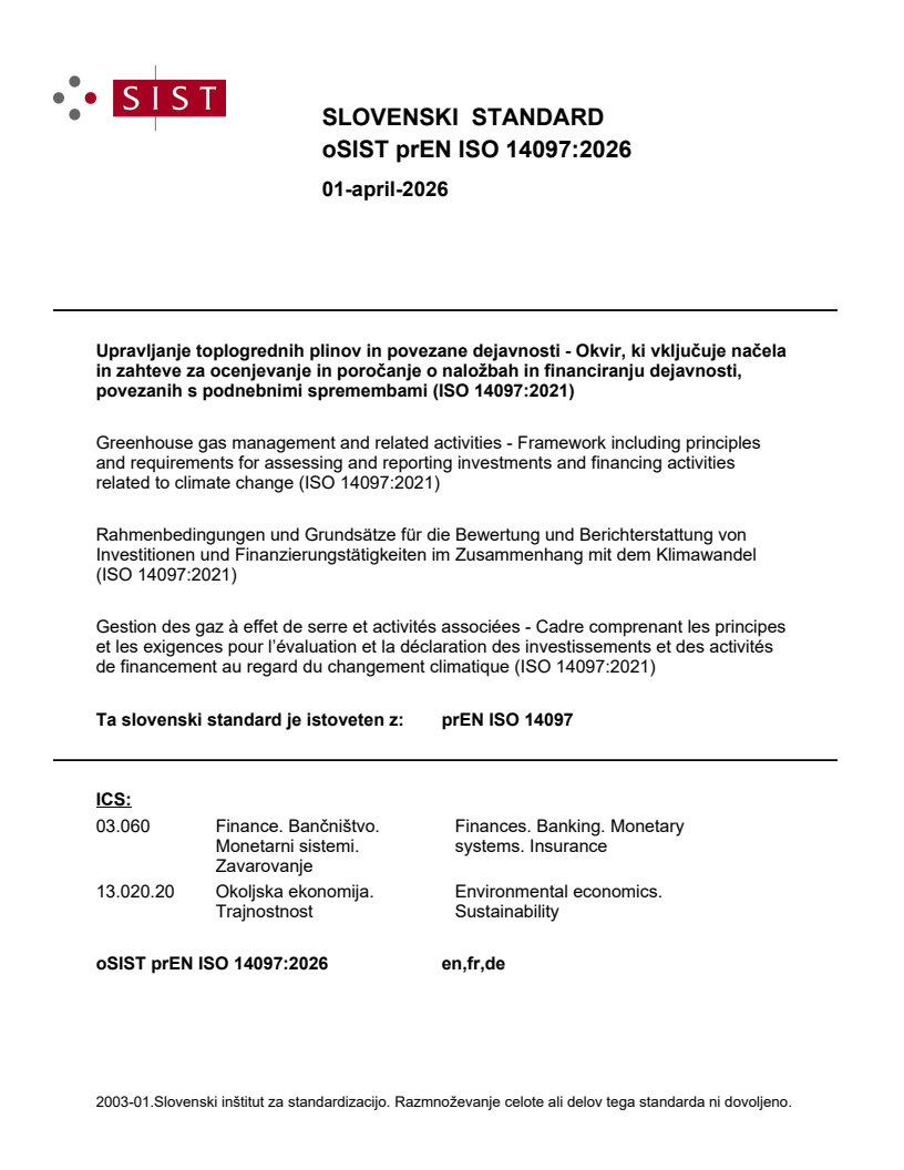 Upravljanje toplogrednih plinov in povezane dejavnosti - Okvir, ki vključuje načela in zahteve za ocenjevanje in poročanje o naložbah in financiranju dejavnosti, povezanih s podnebnimi spremembami (ISO 14097:2021)