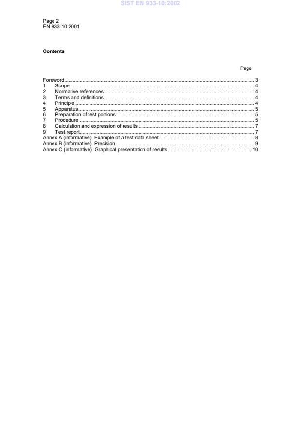 Page 2EN 933-10:2001ContentsPageForeword.31Scope.42Normative references.43Terms and definitions.44Principle.45Apparatus.56Preparation of test portions.57Procedure.58Calculation and expression of results.79Test report.7Annex A (informative)