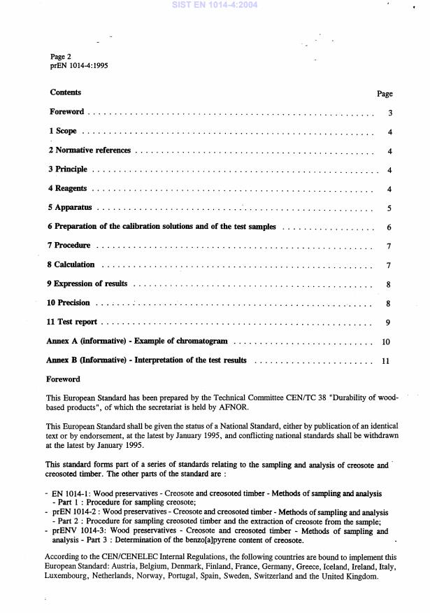 EN 1014-4:1995 is a standard published by the European Committee for Standardization (CEN). Its full title is "Wood preservatives - Creosote and creosoted timber - Methods of sampling and analysis - Part 4: Determination of the water-extractable phenols content of creostote". This standard covers: This Part of EN 1014 specifies a high performance liquid chromatographic (HPLC) method for the determination of the water-extractable phenols content of creosote. For reasons of precision, this standard is applicable to the determination of the water-extractable phenols content of creosotes containing more than 10 g of water-extractable phenols/kg of creosote.