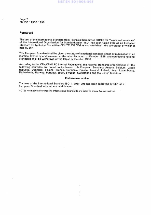 IS0 11908:1996(E) Foreword IS0 (the International Organization for Standardization) is a worldwide fed- eration of national standards bodies (IS0 member bodies). The work of preparing International Standards is normally carried out through technical committees. Each member body interested in a subject which a technical committee has been established has the right to be resented on that committee. International organizations, governmental non-governmental, in liaison with ISO, also take part in the work. IS0 laborates closely with the International Electrotechnical Commission ( on all matters of electrotechnical standardization. IS0 for rep- and col- EC) Draft International Standards adopted by the technical committees are cir- culated to the member bodies for voting. Publication as an International Standard requires approval by at least 75 % of the member bodies casting a vote. International Standard IS0 11908 was prepared by Technical Committee ISO/TC 35, Paints and varnishes, Subcommittee SC 10, Test methods for binders for paints and varnishes. Annex A forms an integral part of this International Standard. 0 IS0 1996 All rights reserved. Unless otherwise specified, no part of this publication may be repro- duced or utilized in any form or by any means, electronic or mechanical, including photo- copying and microfilm, without permission in writing from the publisher. International Organization for Standardization Case Postale 56 l CH-1211 Geneve 20 l Switzerland Printed in Switzerland ii SIST EN ISO 11908:1998