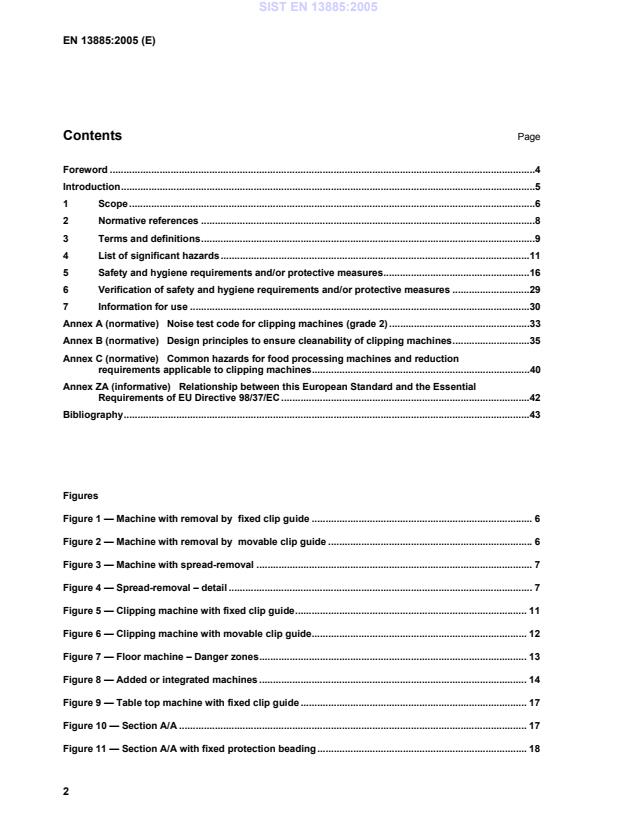 EN 13885:2005 is a standard published by the European Committee for Standardization (CEN). Its full title is "Food processing machinery - Clipping machines - Safety and hygiene requirements". This standard covers: 1This European Standard specifies safety and hygiene requirements to minimise the hazards which can arise during the commissioning, the use and the maintenance of clipping machines for portioning and closing of casings filled with foodstuffs, and intended to be used in butcheries, meat processing factories, main kitchens and other food processing factories. This European Standard deals with all significant hazards, hazardous situations and events relevant to clipping machines, when they are used as intended and under the conditions foreseen by the manufacturer (see Clause 4). This European Standard is not applicable to clipping machines which are manufactured before the date of publication of this European Standard by CEN. 1.2 This document covers the following types of machines: Concerning the sort of actuation: - machine for gathering up by hand, power motioned locking-stroke; - machine for automatic-motioned gathering and automatic-motioned locking-stroke. Concerning the removal-system: - machine with removal by fixed or movable clip-guide (see Figures 1 and 2); - machine with spread-removal (see Figures 3 and 4).