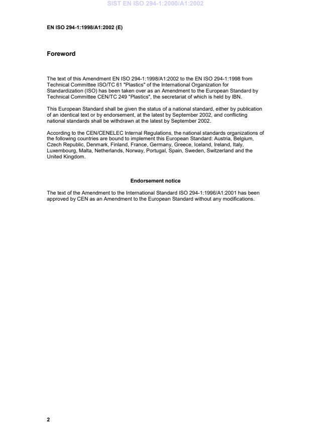 The text of this Amendment EN ISO 294-1:1998/A1:2002 to the EN ISO 294-1:1998 from