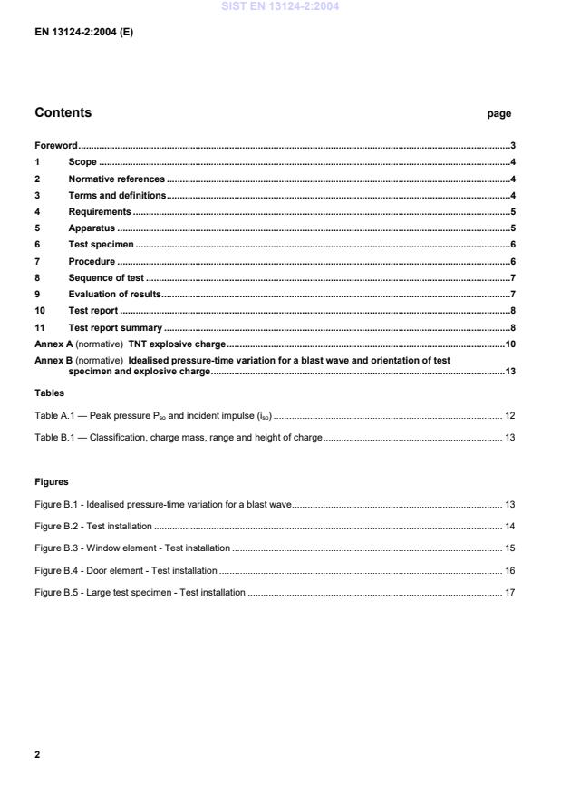 Idealised pressure-time variation for a blast wave and orientation of testspecimen and explosive charge.13TablesTable A.1 — Peak pressure Pso and incident impulse (iso).12Table B.1 — Classification, charge mass, range and height of charge.13FiguresFigure B.1 - Idealised pressure-time variation for a blast wave.13Figure B.2 - Test installation.14Figure B.3 - Window element - Test installation.15Figure B.4 - Door element - Test installation.16Figure B.5 - Large test specimen - Test installation.17SIST EN 13124-2:2004