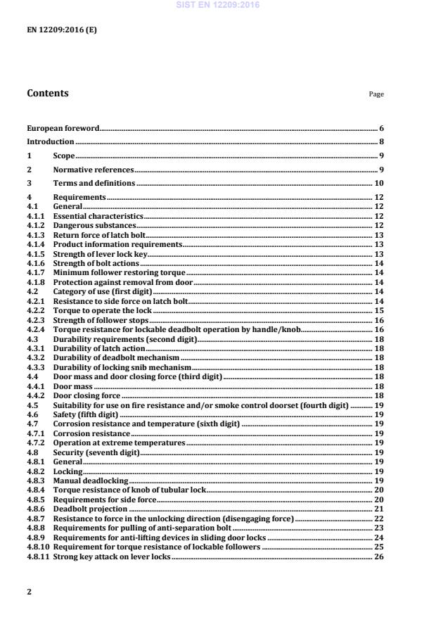 European foreword . 6 Introduction . 8 1 Scope . 9 2 Normative references . 9 3 Terms and definitions . 10 4 Requirements . 12 4.1 General . 12 4.1.1 Essential characteristics . 12 4.1.2 Dangerous substances . 12 4.1.3 Return force of latch bolt . 13 4.1.4 Product information requirements . 13 4.1.5 Strength of lever lock key . 13 4.1.6 Strength of bolt actions . 14 4.1.7 Minimum follower restoring torque . 14 4.1.8 Protection against removal from door . 14 4.2 Category of use (first digit) . 14 4.2.1 Resistance to side force on latch bolt . 14 4.2.2 Torque to operate the lock . 15 4.2.3 Strength of follower stops . 16 4.2.4 Torque resistance for lockable deadbolt operation by handle/knob. 16 4.3 Durability requirements (second digit) . 18 4.3.1 Durability of latch action . 18 4.3.2 Durability of deadbolt mechanism . 18 4.3.3 Durability of locking snib mechanism . 18 4.4 Door mass and door closing force (third digit) . 18 4.4.1 Door mass . 18 4.4.2 Door closing force . 18 4.5 Suitability for use on fire resistance and/or smoke control doorset (fourth digit) . 19 4.6 Safety (fifth digit) . 19 4.7 Corrosion resistance and temperature (sixth digit) . 19 4.7.1 Corrosion resistance . 19 4.7.2 Operation at extreme temperatures . 19 4.8 Security (seventh digit) . 19 4.8.1 General . 19 4.8.2 Locking . 19 4.8.3 Manual deadlocking . 19 4.8.4 Torque resistance of knob of tubular lock . 20 4.8.5 Requirements for side force . 20 4.8.6 Deadbolt projection . 21 4.8.7 Resistance to force in the unlocking direction (disengaging force) . 22 4.8.8 Requirements for pulling of anti-separation bolt . 23 4.8.9 Requirements for anti-lifting devices in sliding door locks . 24 4.8.10 Requirement for torque resistance of lockable followers . 25 4.8.11 Strong key attack on lever locks . 26 SIST EN 12209:2016