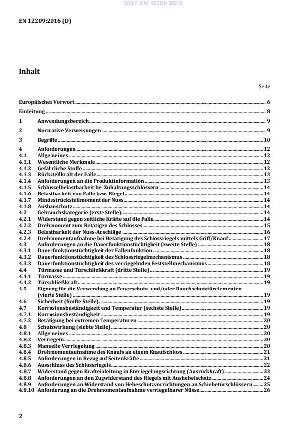 Seite Europäisches Vorwort . 6 Einleitung . 8 1 Anwendungsbereich . 9 2 Normative Verweisungen . 9 3 Begriffe . 10 4 Anforderungen . 12 4.1 Allgemeines . 12 4.1.1 Wesentliche Merkmale . 12 4.1.2 Gefährliche Stoffe . 12 4.1.3 Rückstellkraft der Falle . 13 4.1.4 Anforderungen an die Produktinformation . 13 4.1.5 Schlüsselbelastbarkeit bei Zuhaltungsschlössern . 14 4.1.6 Belastbarkeit von Falle bzw. Riegel . 14 4.1.7 Mindestrückstellmoment der Nuss . 14 4.1.8 Ausbauschutz . 14 4.2 Gebrauchskategorie (erste Stelle). 14 4.2.1 Widerstand gegen seitliche Kräfte auf die Falle . 14 4.2.2 Drehmoment zum Betätigen des Schlosses . 15 4.2.3 Belastbarkeit der Nuss-Anschläge . 16 4.2.4 Drehmomentaufnahme bei Betätigung des Schlossriegels mittels Griff/Knauf . 17 4.3 Anforderungen an die Dauerfunktionstüchtigkeit (zweite Stelle) . 18 4.3.1 Dauerfunktionstüchtigkeit der Fallenfunktion . 18 4.3.2 Dauerfunktionstüchtigkeit des Schlossriegelmechanismus . 18 4.3.3 Dauerfunktionstüchtigkeit des verriegelnden Feststellmechanismus . 18 4.4 Türmasse und Türschließkraft (dritte Stelle) . 19 4.4.1 Türmasse . 19 4.4.2 Türschließkraft . 19 4.5 Eignung für die Verwendung an Feuerschutz- und/oder Rauchschutztürelementen (vierte Stelle) . 19 4.6 Sicherheit (fünfte Stelle) . 19 4.7 Korrosionsbeständigkeit und Temperatur (sechste Stelle) . 19 4.7.1 Korrosionsbeständigkeit . 19 4.7.2 Betätigung bei extremen Temperaturen . 20 4.8 Schutzwirkung (siebte Stelle) . 20 4.8.1 Allgemeines . 20 4.8.2 Verriegeln . 20 4.8.3 Manuelle Verriegelung . 20 4.8.4 Drehmomentaufnahme des Knaufs an einem Knaufschloss . 21 4.8.5 Anforderungen in Bezug auf Seitenkräfte . 21 4.8.6 Ausschluss des Schlossriegels . 22 4.8.7 Widerstand gegen Krafteinleitung in Entriegelungsrichtung (Ausrückkraft) . 23 4.8.8 Anforderungen an den Zugwiderstand des Riegels mit Aushebelschutz . 24 4.8.9 Anforderungen an Widerstand von Hebeschutzvorrichtungen an Schiebetürschlössern . 25 4.8.10 Anforderung an die Drehmomentaufnahme verriegelbarer Nüsse. 26 SIST EN 12209:2016