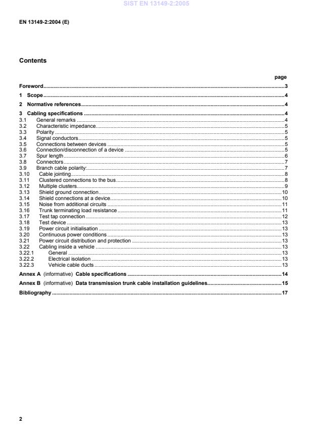 3 Cabling specifications 3.1 General remarks The principles for the coupling of devices to the data transmission bus focus upon the longer term objectives which are to achieve the least necessary number of variants, rather than to allow for the profusion of interim and migratory solutions which may occur initially. This is especially important for public transport road vehicles, which are generally equipped in different non-correlated stages (for example, first the fare collection system, then the radio and automatic location system some months or years later, etc.) SIST EN 13149-2:2005