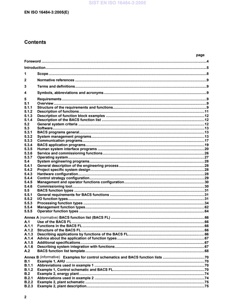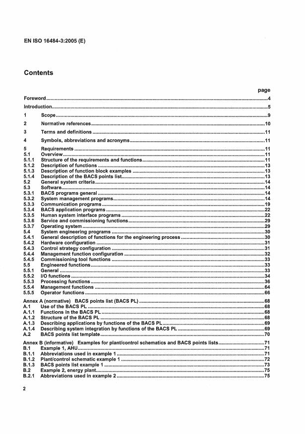 EN ISO 16484-3:2005 is a standard published by the European Committee for Standardization (CEN). Its full title is "Building automation and control systems (BACS) - Part 3: Functions (ISO 16484-3:2005)". This standard covers: ISO 16484-3:2005 specifies the requirements for the overall functionality and engineering services to achieve building automation and control systems. It defines terms, which shall be used for specifications and it gives guidelines for the functional documentation of project/application specific systems. It provides a sample template for documentation of plant/application specific functions, called BACS points list. The informative function block examples explain a method to display the referenced functions in system documentation; they do not standardize the method for programming functions and applications. ISO 16484-3:2005 covers requirements and definitions regarding BACS and application software, generic functions for plant/project specific applications and engineering functions for building controls and operations. It provides communication functions for the integration of other dedicated special system processes. ISO 16484-3:2005 defines a method for specifying the procurement specifications containing all essential elements required for the operational functioning of a BACS. The successful installation and operation of a BACS requires that its procurement be based on a complete and accurate functional specification.