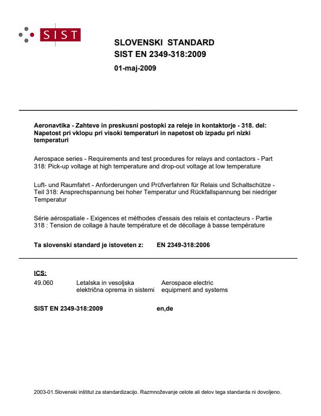 EN 2349-318:2006 is a standard published by the European Committee for Standardization (CEN). Its full title is "Aerospace series - Requirements and test procedures for relays and contactors - Part 318: Pick-up voltage at high temperature and drop-out voltage at low temperature". This standard covers: This standard specifies a method for testing the pick-up voltage at high temperature and release voltage at low temperature of relays and contactors. It shall be used together with EN 2349-100.