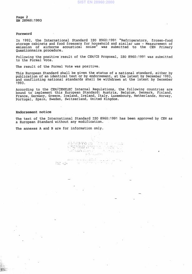 EN 28960:1993 is a standard published by the European Committee for Standardization (CEN). Its full title is "Refrigerators, frozen-food storage cabinets and food freezers for household and similar use - Measurement of emission of airborne acoustical noise (ISO 8960:1991)". This standard covers: 2011-11-07 GVN: This EN should be withdrawn at the publication date of CLC/TC 59X future EN 60704-2-14 (CELIS PR=23530) 2010-03-09 EMA: Through BT C53/2007, CEN/BT approved the transfer of EN 28960:1993 to CENELEC. This WI will be withdrawn at the DOW of the new edition.