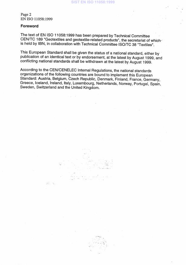 EN ISO 11058:1999 is a standard published by the European Committee for Standardization (CEN). Its full title is "Geotextiles and geotextile-related products - Determination of water permeability characteristics normal to the plane, without load (ISO 11058:1999)". This standard covers: This European Standard specifies two test methods for determining the water permeability characteristics of a single layer of geotextile or geotextile-related product normal to the plane: the constant head method and the falling head method. Note: If the full permeability characteristics of the geotextile or geotextile-related product have previously been established, then for control purposes it can be sufficient to determine the velocity index at a head loss of 50 mm only.