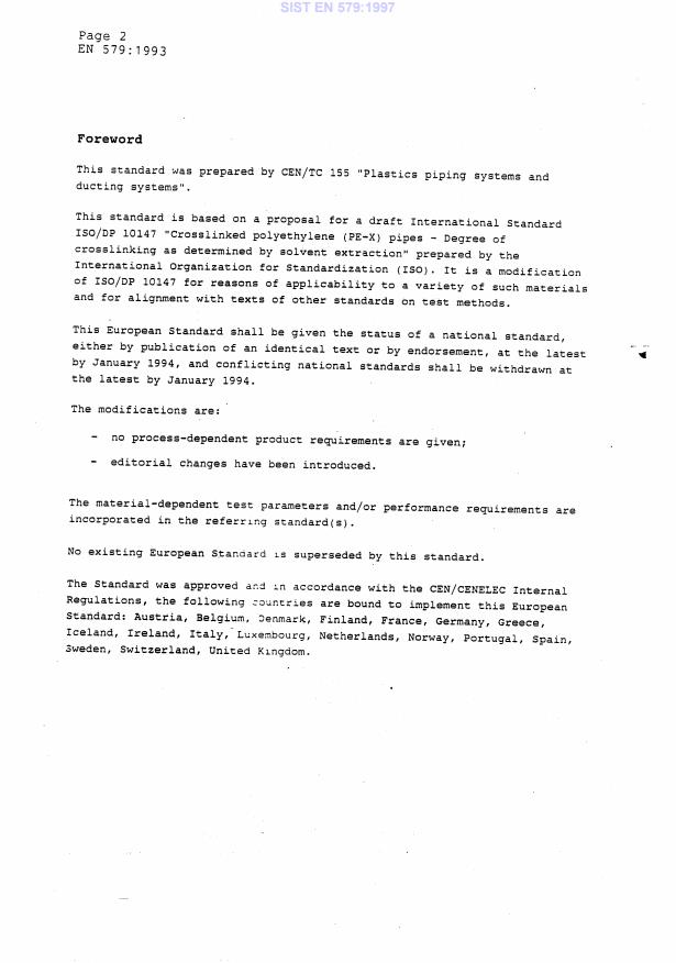 EN 579:1993 is a standard published by the European Committee for Standardization (CEN). Its full title is "Plastics piping systems - Crosslinked polyethylene (PE-X) pipes - Determination of degree of crosslinking by solvent extraction". This standard covers: This standard specifies a method for determining the resistance of unplasticized poly(vinyl chloride) (PVC-U) pipes to dichloromethane at a specified temperature (DCMT). This standard applies to PVC-U pipes, irrespective of their use. The method can be used as a rapid means of quality control during manufacture.