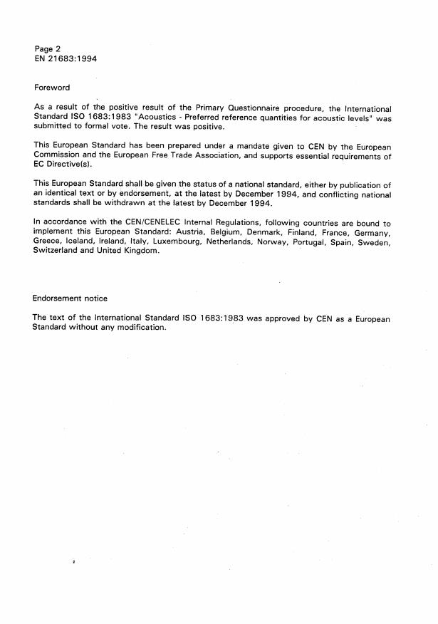 EN 21683:1994 is a standard published by the European Committee for Standardization (CEN). Its full title is "Acoustics - Preferred reference quantities for acoustic levels (ISO 1683:1983)". This standard covers: Acoustics - Preferred reference quantities for acoustic levels (ISO 1683:1983)