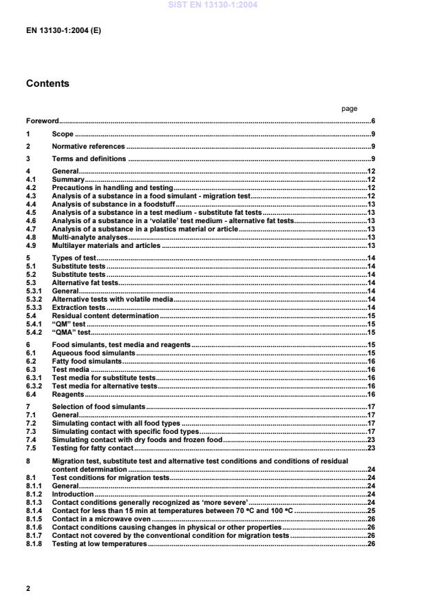 page Foreword.6 1 Scope.9 2 Normative references.9 3 Terms and definitions.9 4 General.12 4.1 Summary.12 4.2 Precautions in handling and testing.12 4.3 Analysis of a substance in a food simulant - migration test.12 4.4 Analysis of substance in a foodstuff.13 4.5 Analysis of a substance in a test medium - substitute fat tests.13 4.6 Analysis of a substance in a ‘volatile’ test medium - alternative fat tests.13 4.7 Analysis of a substance in a plastics material or article.13 4.8 Multi-analyte analyses.13 4.9 Multilayer materials and articles.13 5 Types of test.14 5.1 Substitute tests.14 5.2 Substitute tests.14 5.3 Alternative fat tests.14 5.3.1 General.14 5.3.2 Alternative tests with volatile media.14 5.3.3 Extraction tests.14 5.4 Residual content determination.15 5.4.1 “QM” test.15 5.4.2 “QMA” test.15 6 Food simulants, test media and reagents.15 6.1 Aqueous food simulants.15 6.2 Fatty food simulants.16 6.3 Test media.16 6.3.1 Test media for substitute tests.16 6.3.2 Test media for alternative tests.16 6.4 Reagents.16 7 Selection of food simulants.17 7.1 General.17 7.2 Simulating contact with all food types.17 7.3 Simulating contact with specific food types.17 7.4 Simulating contact with dry foods and frozen food.23 7.5 Testing for fatty contact.23 8 Migration test, substitute test and alternative test conditions and conditions of residual content determination.24 8.1 Test conditions for migration tests.24 8.1.1 General.24 8.1.2 Introduction.24 8.1.3 Contact conditions generally recognized as ‘more severe’.24 8.1.4 Contact for less than 15 min at temperatures between 70 °°°°C and 100 °°°°C.25 8.1.5 Contact in a microwave oven.26 8.1.6 Contact conditions causing changes in physical or other properties.26 8.1.7 Contact not covered by the conventional condition for migration tests.26 8.1.8 Testing at low temperatures.26 SIST EN 13130-1:2004