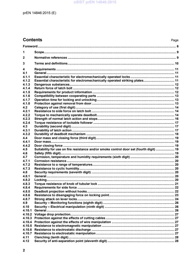 prEN 14846 is a draft published by the European Committee for Standardization (CEN). Its full title is "Building hardware - Locks and latches - Electromechanically operated locks and striking plates - Requirements and test methods". This standard covers: This European Standard specifies requirements and test methods for strength, security, durability and function of electrical and electronic components for all types of electromechanically operated locks and striking plates used on doors, window doors and entrance doors in buildings. Requirements relating to the purely mechanical feature of products included in this European Standard (e.g. resistance to drilling/side load) are covered by EN 12209. This European Standard covers electromechanically operated locks and striking plates which are either manufactured and placed on the market in their entirety by one producer or assembled from sub-assemblies produced by more than one producer and designed to be used in combination. This document is not applicable to electrically powered hold-open devices (EN 1155), electrically controlled panic exit systems (prEN 13633) or electrically controlled emergency exit systems (prEN 13637). It does not apply to purely magnetic locks, mechatronic or mechanical cylinders (EN 1303), handles (EN 1906), locks for windows, padlocks (EN 12320), locks for safes (EN 1300), furniture locks or prison locks, nor does it apply to cover operating and identification devices (such as mechanical cylinders, intelligent cards, digit codes, magnetic cards). This European Standard does not, for the time being, apply to electromagnetic door locks but these devices will be considered for inclusion in the first revision of this European Standard.