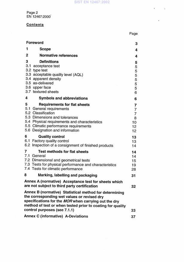 EN 12467:2000 is a standard published by the European Committee for Standardization (CEN). Its full title is "Fibre-cement flat sheets - Product specifications and test methods". This standard covers: The European standard specifies the technical requirements and establishes methods of inspection and test as well as acceptance conditions for fibre-cement flat sheets, siding shingles and planks (later referred to as sheets) having an apparent density greater than 1,0 kg/dm3 for one or more of the following uses: - internal wall and ceiling finishes; - external wall and ceiling finishes; - roofing underlayers. This standard covers sheets reinforced with fibres of different types as specified in 5.1.1. This standard does not cover sheets designed for fire protection purposes.