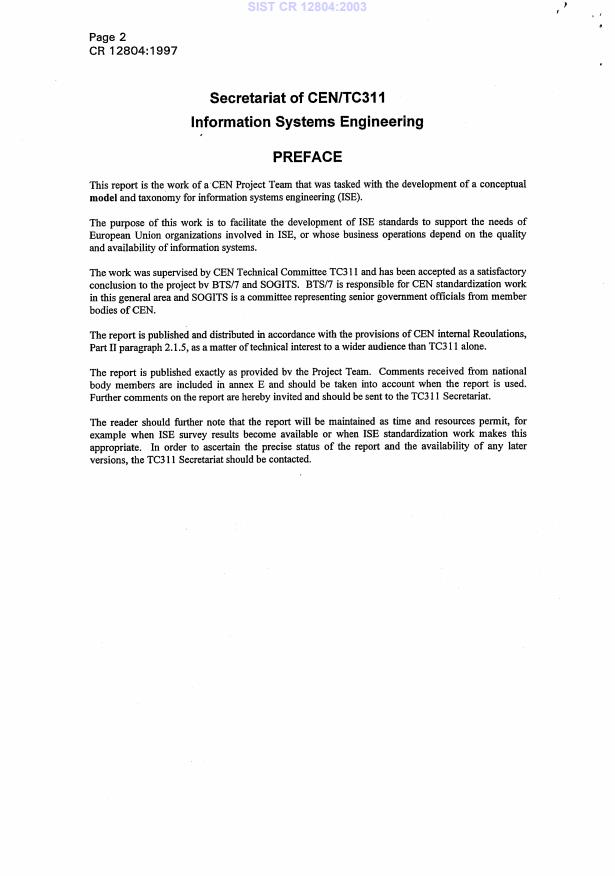 CR 12804:1997 is a standardization document published by the European Committee for Standardization (CEN). Its full title is "Conceptual model and taxonomy for information systems engineering". This standard covers: No scope available