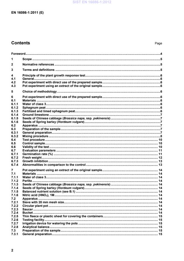 4.2 Pot experiment with direct use of the prepared sample Sowing a defined quantity of Chinese cabbage into pots containing the prepared sample, cultivating under controlled conditions for a defined period of time and evaluating the plant response by determining the germination rate, fresh weight, abnormalities and overall plant growth. If the presence of graminacious herbicides is suspected, Spring barley shall be used in addition to Chinese cabbage. For testing of other specific effects, the use of additional plant species (for example lettuce) can be considered. 4.3 Pot experiment using an extract of the original sample Mixing the original sample with nutrient solution as an extractant, soaking for 4 h at ambient temperature and collecting the freely available nutrient solution. Filling pots with perlite saturated with the extract and continuing as described under 4.2, irrigating during the test period with a fixed quantity of the extract and afterwards water. If the presence of graminacious herbicides is suspected, Spring barley shall be used in addition to Chinese cabbage. For testing of other specific effects, the use of additional plant species (for example lettuce) can be considered. 5 Choice of methodology For most materials, the pot growth test can be carried out as described in Clause 6. However, for coarse materials such as bark, expanded clay, lava, mineral wool, perlite, polyurethane and pumice with an inherently low water holding capacity which are used as growing media without amendment, this procedure is unsuitable and the extract method described in Clause 7 shall be adopted. 6 Pot experiment with direct use of the prepared sample 6.1 Materials