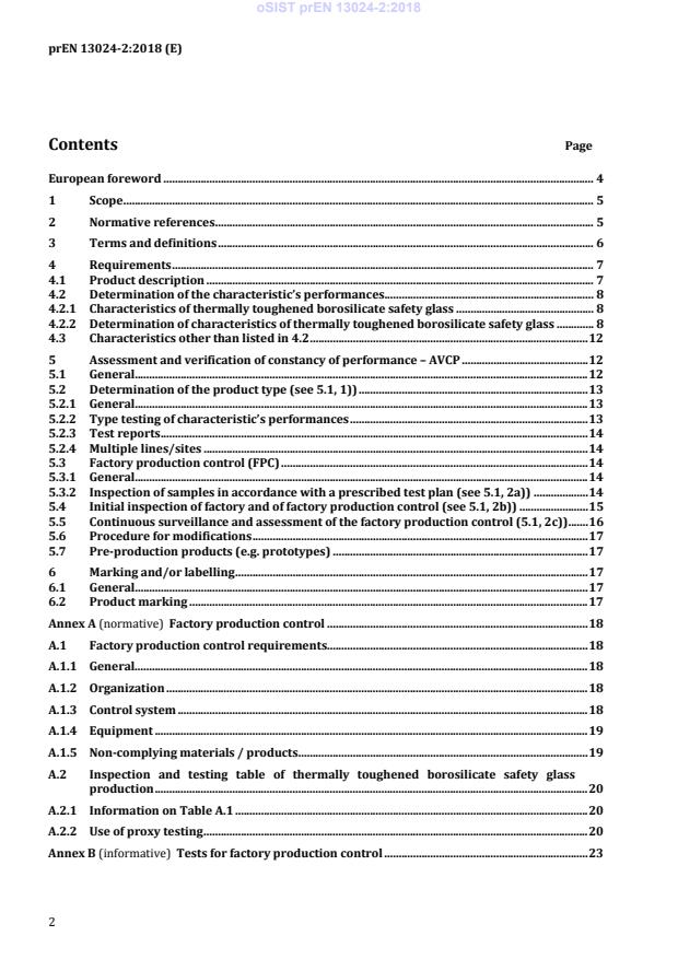 FprEN 13024-2 is a draft published by the European Committee for Standardization (CEN). Its full title is "Glass in building - Thermally toughened borosilicate safety glass - Part 2: Product standard". This standard covers: This document covers the assessment and verification of constancy of performances and the factory production control of flat thermally toughened borosilicate safety glass for use in buildings. NOTE For glass products with electrical wiring or connections for, e.g. alarm or heating purposes, other directives, e.g. Low Voltage Directive, may apply.