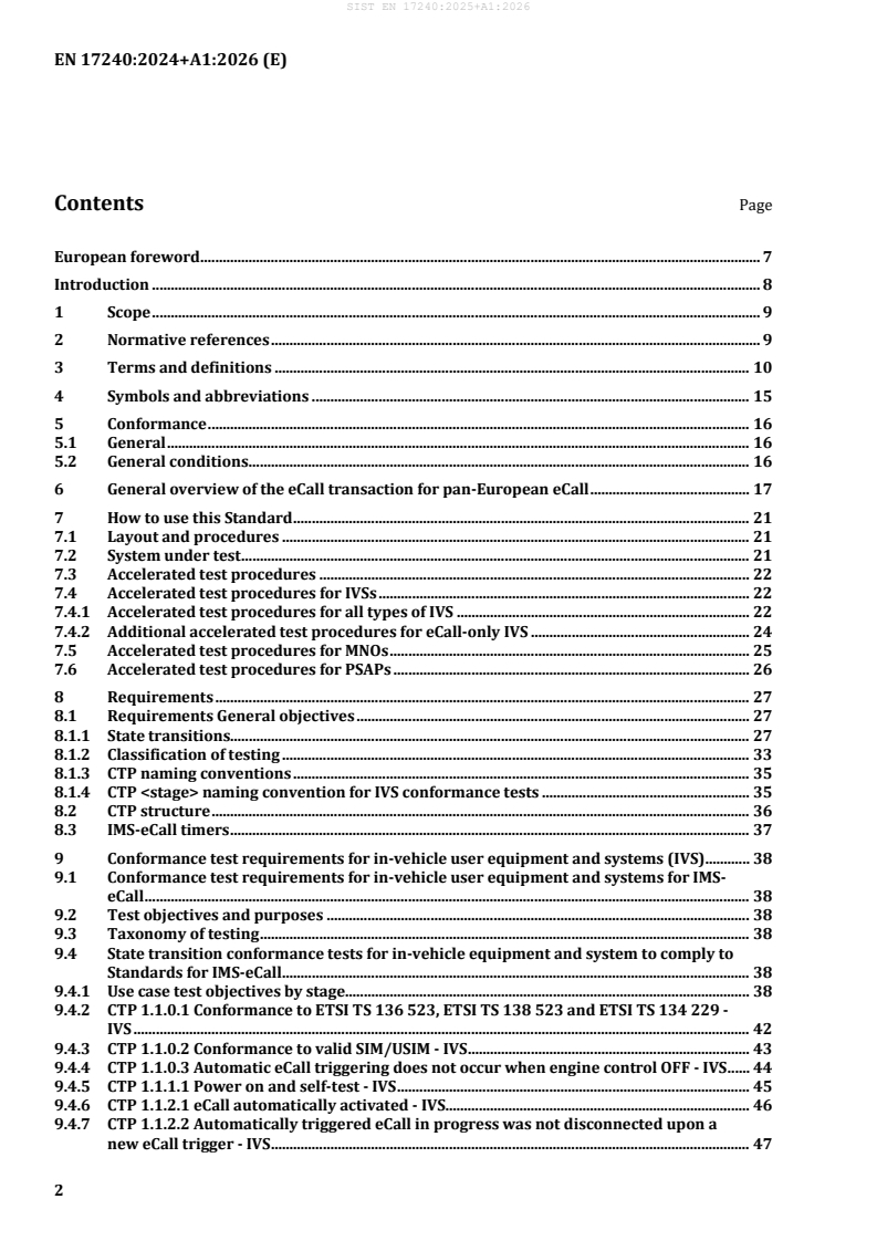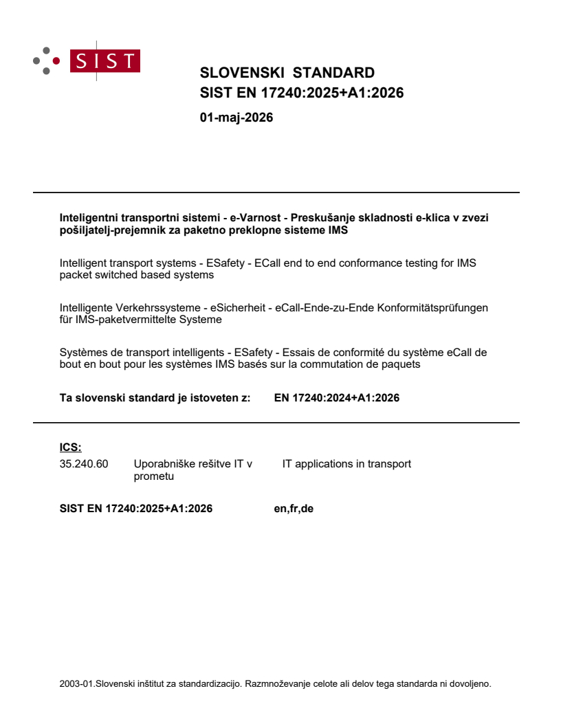 EN 17240:2024+A1:2026 is a European Standard developed by CEN, focusing on Intelligent Transport Systems (ITS), specifically addressing eSafety through eCall end-to-end conformance testing for IMS packet switched based systems. This standard establishes a set of conformance tests to verify the interoperability and compliance of key actors in the eCall chain-including the In-Vehicle System (IVS), Mobile Network Operator (MNO), and Public Safety Answering Point (PSAP)-when operating over modern IP Multimedia Subsystem (IMS) networks, such as LTE/4G and their successors. The transition from circuit-switched to packet-switched communication technologies is a significant aspect of this standard, ensuring futureproof testing methodologies for pan-European eCall services.