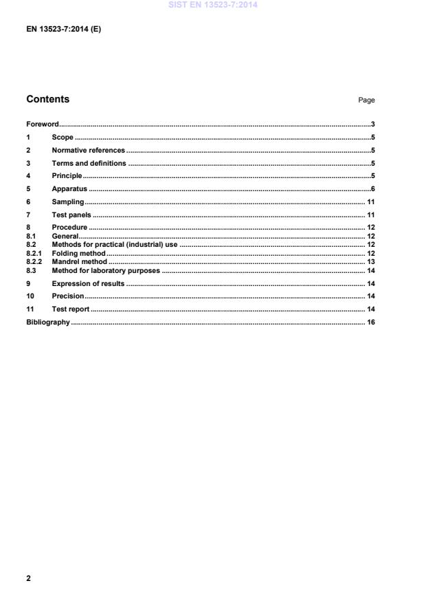 This part of EN 13523 specifies the procedure for determining the resistance to cracking of an organic coating on a metallic substrate when bent through 135° to 180°. The degree of adhesion may also be evaluated. Both folding and mandrel methods are considered. The folding method is more often used for practical purposes but where more precise determinations are required, the mandrel method is recommended. The cylindrical bend method may also be used for a pass/fail decision by using an agreed mandrel. The choice of the appropriate test method is limited by the thickness and/or the hardness of the substrate. The feasibility of the test depends on the type and thickness of the substrate. During the procedure, the mandrel should not deform.
