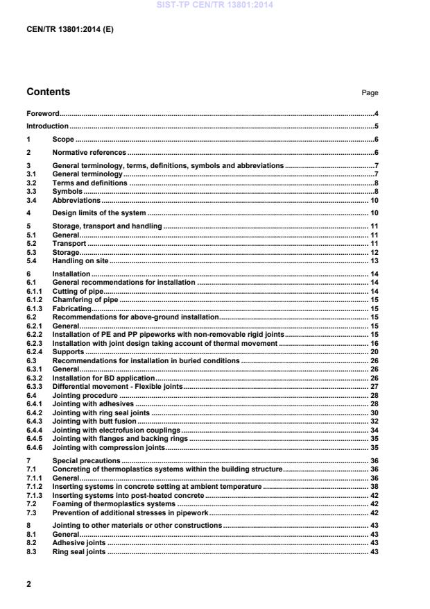 This Technical Report gives the recommended practice for installation of thermoplastics piping systems in the field of soil and waste discharge (low and high temperature) inside buildings (marked with "B") and of soil and waste discharge systems for both inside buildings and buried in ground within the building structure (marked with "BD").