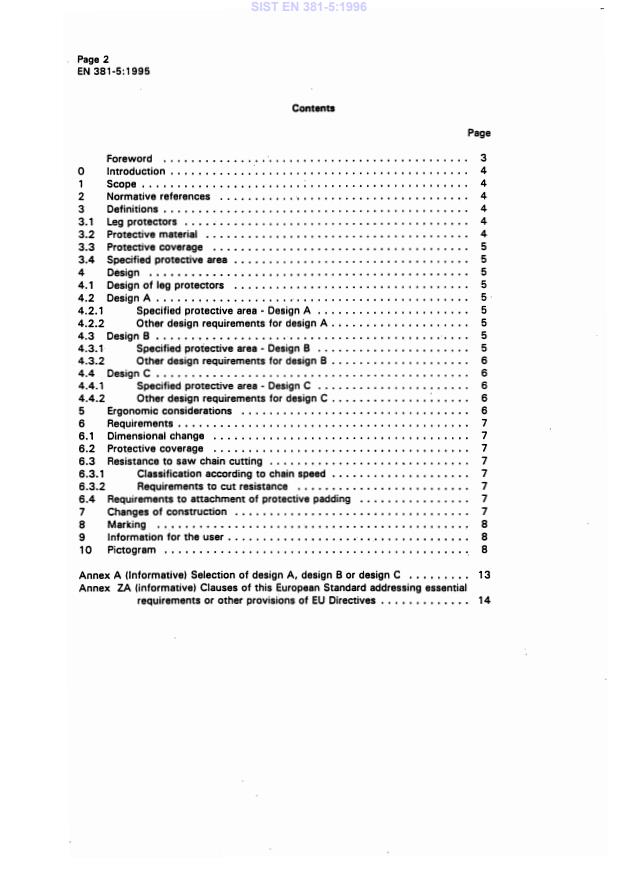 EN 381-5:1995 is a standard published by the European Committee for Standardization (CEN). Its full title is "Protective clothing for users of hand-held chain saws - Part 5: Requirements for leg protectors". This standard covers: This European Standard defines design and specifies the requirements for leg protectors which offers protection against cutting from a hand-held chain saw including the requirements for identification, marking and information for the user.