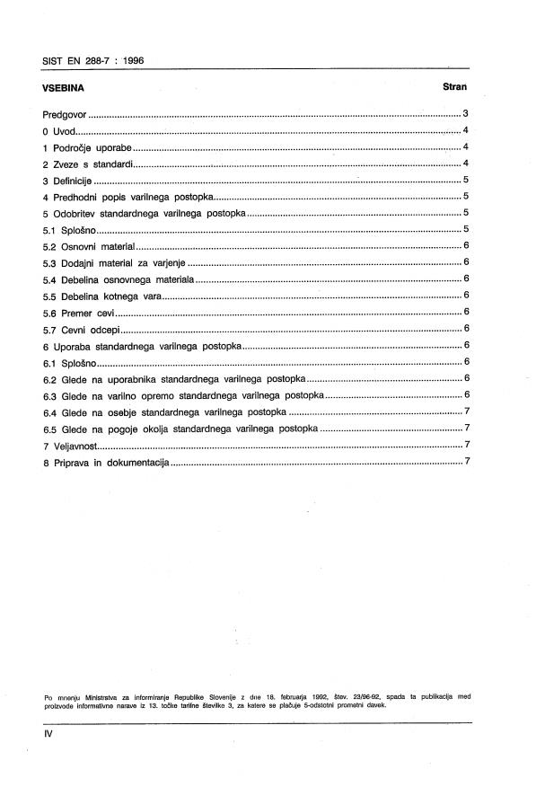 EN 288-7:1995 is a standard + national annex and/or foreword published by the European Committee for Standardization (CEN). Its full title is "Specification and approval of welding procedures for metallic materials - Part 7: Approval by a standard welding procedure for arc welding". This standard covers: This standard defines the conditions for the approval of a standard welding procedure and establishes the conditions, limits and ranges of approval necessary for the use of standard welding procedures. The use of a standard of welding procedure can be restricted by an application standard or at the enquiry/order stage by contracting parties.