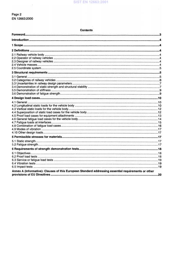 EN 12663:2000 is a standard published by the European Committee for Standardization (CEN). Its full title is "Railway applications - Structural requirements of railway vehicle bodies". This standard covers: This European Standard defines minimum structural requirements for railway vehicle bodies. This European Standard specifies the loads vehicle bodies shall be capable of sustaining, identifies how material data shall be used and presents the principles to be used for design verification by analysis and testing. The railway vehicles are divided into categories which are defined only with respect to the structural requirements of the vehicle bodies. These structural requirements should not be confused with operating requirements. It is the responsibility of the operator to decide as to which structural category railway vehicles shall be designed. Some vehicles may not fit into any of the defined categories; the structural requirements for such railway vehicles should be specified by the operator using the principles presented in this European Standard. The standard applies to all railway vehicles within the EU and EFTA territories. The specified requirements assume operating conditions and circumstances such as are prevalent in these countries.