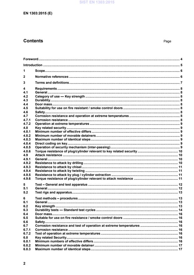 Foreword . 4 Introduction . 5 1 Scope. 6 2 Normative references . 6 3 Terms and definitions . 7 4 Requirements . 8 4.1 General . 8 4.2 Category of use — Key strength . 8 4.3 Durability . 8 4.4 Door mass . 8 4.5 Suitability for use on fire resistant / smoke control doors . 8 4.6 Safety. 8 4.7 Corrosion resistance and operation at extreme temperatures . 8 4.7.1 Corrosion resistance . 8 4.7.2 Operation at extreme temperatures . 9 4.8 Key related security . 9 4.8.1 Minimum number of effective differs . 9 4.8.2 Minimum number of movable detainers . 9 4.8.3 Maximum number of identical steps . 9 4.8.4 Direct coding on key . 9 4.8.5 Operation of security mechanism (inter-passing) . 9 4.8.6 Torque resistance of plug/cylinder relevant to key related security . 10 4.9 Attack resistance . 10 4.9.1 General . 10 4.9.2 Resistance to attack by drilling . 10 4.9.3 Resistance to attack by chisel . 11 4.9.4 Resistance to attack by twisting . 11 4.9.5 Resistance to attack by plug / cylinder extraction . 11 4.9.6 Torque resistance of plug/cylinder relevant to attack resistance . 11 5 Test – General and test apparatus . 12 5.1 General . 12 5.2 Test rigs and apparatus. 13 6 Test methods – procedures . 13 6.1 General . 13 6.2 Key strength . 13 6.3 Durability tests — Standard test cycles . 14 6.4 Door mass . 16 6.5 Suitable for use on fire resistance / smoke control doors . 16 6.6 Safety. 16 6.7 Corrosion resistance and test of operation at extreme temperatures . 16 6.7.1 Corrosion resistance . 16 6.7.2 Test of operation at extreme temperatures . 16 6.8 Key related Security . 16 6.8.1 Minimum numbers of effective differs . 16 6.8.2 Minimum number of movable detainer . 17 6.8.3 Maximum number of identical steps . 17 SIST EN 1303:2015