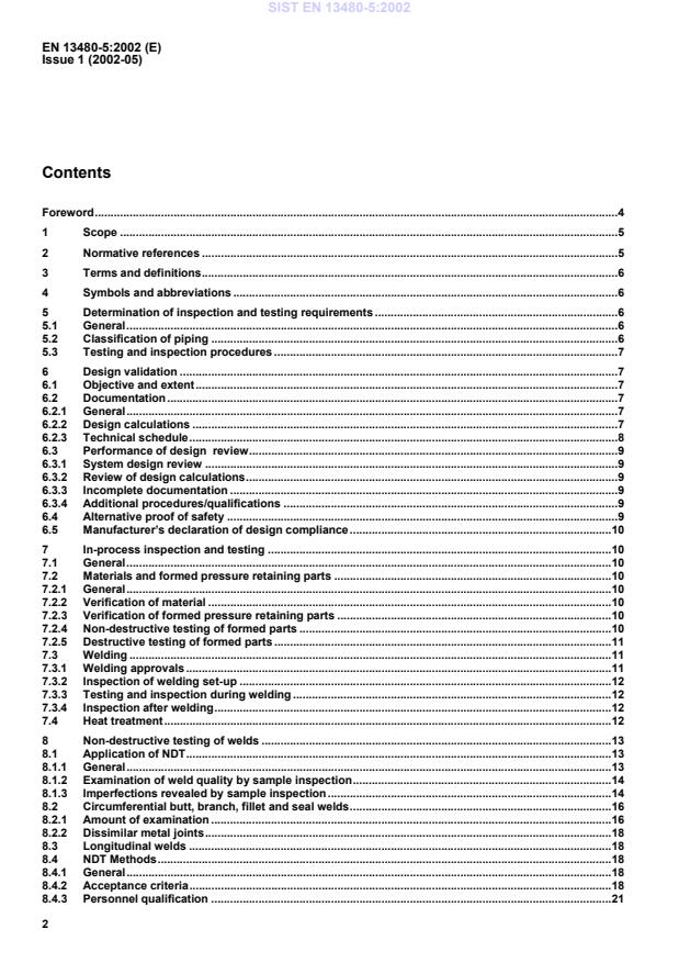 review.96.3.1System design review.96.3.2Review of design calculations.96.3.3Incomplete documentation.96.3.4Additional procedures/qualifications.96.4Alternative proof of safety.96.5Manufacturer’s declaration of design compliance.107In-process inspection and testing.107.1General.107.2Materials and formed pressure retaining parts.107.2.1General.107.2.2Verification of material.107.2.3Verification of formed pressure retaining parts.107.2.4Non-destructive testing of formed parts.107.2.5Destructive testing of formed parts.117.3Welding.117.3.1Welding approvals.117.3.2Inspection of welding set-up.127.3.3Testing and inspection during welding.127.3.4Inspection after welding.127.4Heat treatment.128Non-destructive testing of welds.138.1Application of NDT.138.1.1General.138.1.2Examination of weld quality by sample inspection.148.1.3Imperfections revealed by sample inspection.148.2Circumferential butt, branch, fillet and seal welds.168.2.1Amount of examination.168.2.2Dissimilar metal joints.188.3Longitudinal welds.188.4NDT Methods.188.4.1General.188.4.2Acceptance criteria.188.4.3Personnel qualification.21SIST EN 13480-5:2002