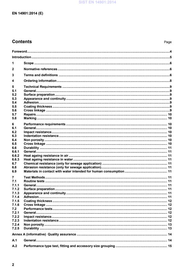 Page Foreword .4 Introduction .5 1 Scope .6 2 Normative references .6 3 Terms and definitions .6 4 Ordering information .8 5 Technical Requirements .9 5.1 General .9 5.2 Surface preparation .9 5.3 Appearance and continuity .9 5.4 Adhesion .9 5.5 Coating thickness .9 5.6 Cross linkage .9 5.7 Repairs . 10 5.8 Marking . 10 6 Performance requirements . 10 6.1 General . 10 6.2 Impact resistance. 10 6.3 Indentation resistance . 10 6.4 Non porosity . 10 6.5 Cross linkage . 10 6.6 Durability . 11 6.6.1 General . 11 6.6.2 Heat ageing resistance in air . 11 6.6.3 Heat ageing resistance in water . 11 6.7 Chemical resistance (only for sewage application) . 11 6.8 Abrasion resistance (only for sewage application) . 11 6.9 Materials in contact with water intended for human consumption . 11 7 Test Methods . 11 7.1 Routine tests . 11 7.1.1 General . 11 7.1.2 Surface preparation . 11 7.1.3 Appearance and continuity . 11 7.1.4 Adhesion . 11 7.1.5 Coating thickness . 12 7.1.6 Cross linkage . 12 7.2 Performance tests. 12 7.2.1 General . 12 7.2.2 Impact resistance. 12 7.2.3 Indentation resistance . 12 7.2.4 Non porosity . 13 7.2.5 Durability . 13 Annex A (informative)