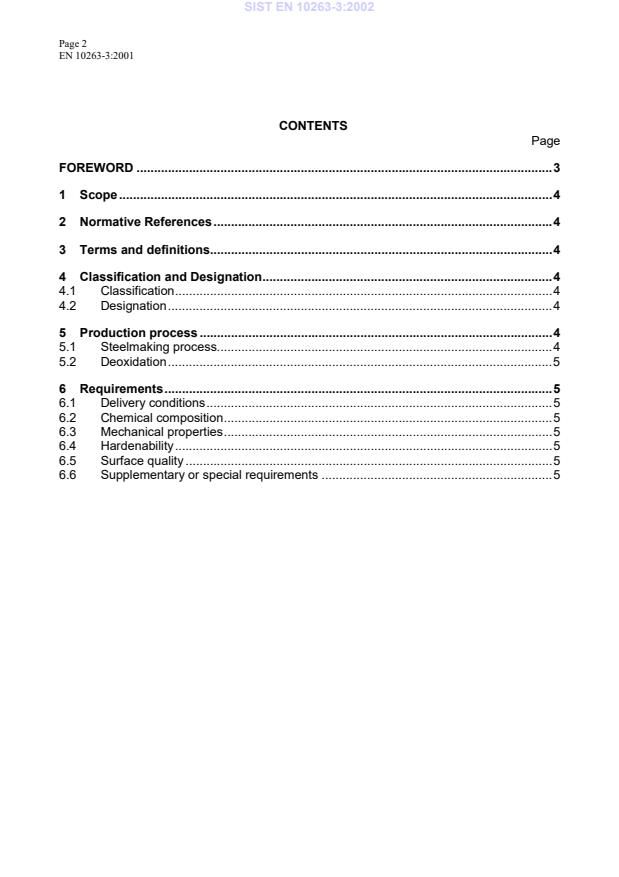Page 2EN 10263-3:2001CONTENTSPageFOREWORD.31Scope.42Normative References.43Terms and definitions.44Classification and Designation.44.1Classification.44.2Designation.45Production process.45.1Steelmaking process.45.2Deoxidation.56Requirements.56.1Delivery conditions.56.2Chemical composition.56.3Mechanical properties.56.4Hardenability.56.5Surface quality.56.6Supplementary or special requirements.5SIST EN 10263-3:2002