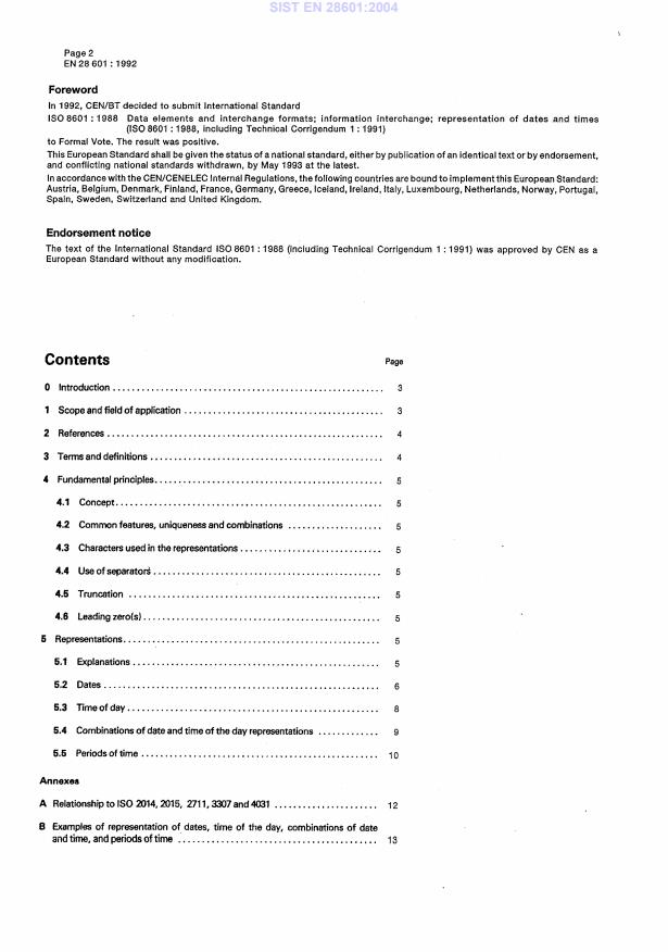 EN 28601:1992 is a standard published by the European Committee for Standardization (CEN). Its full title is "Data elements and interchange formats - Information interchange - Representation of dates and times (ISO 8601:1988 and its technical corrigendum 1:1991)". This standard covers: Data elements and interchange formats - Information interchange - Representation of dates and times (ISO 8601:1988 and its technical corrigendum 1:1991)