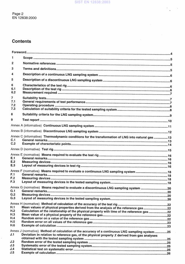 EN 12838:2000 is a standard published by the European Committee for Standardization (CEN). Its full title is "Installations and equipment for liquefied natural gas - Suitability testing of LNG sampling systems". This standard covers: This standard specifies the tests to be carried out in order to assess the suitability of LNG sampling systems designed, in combination with an analytical device such as a chromatograph, to determine the composition of Liquefied Natural Gas.