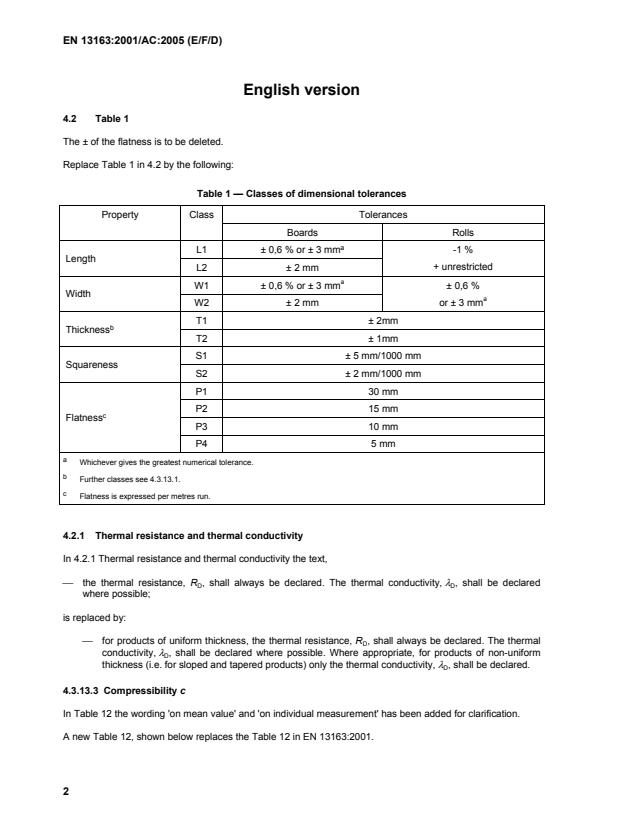 Compressibility c In Table 12 the wording 'on mean value' and 'on individual measurement' has been added for clarification. A new Table 12, shown below replaces the Table 12 in EN 13163:2001.