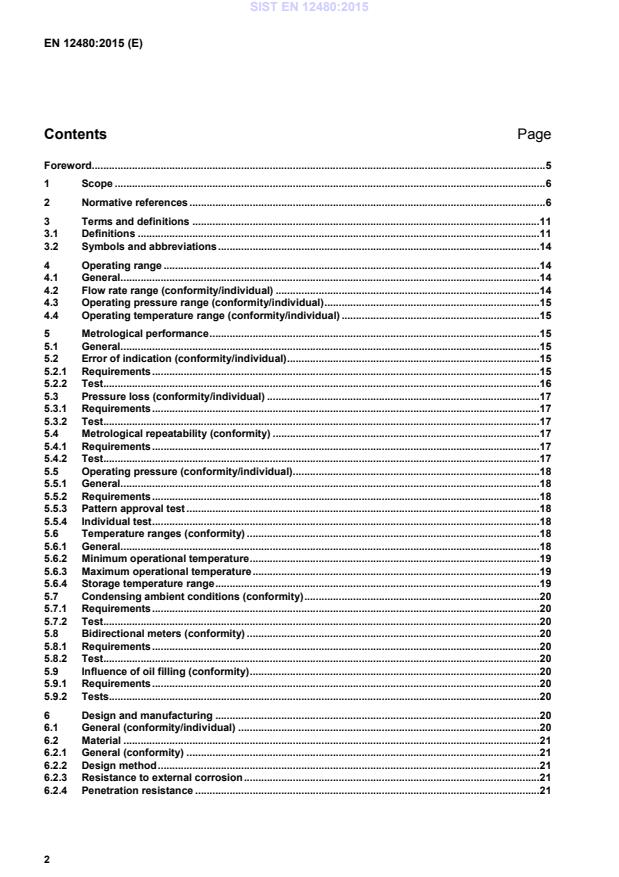 1 Scope This European Standard specifies ranges, construction, performances, output characteristics and testing of rotary displacement gas meters (hereinafter referred to as RD meters or simply meters) for gas volume measurement. This European Standard applies to rotary displacement gas meters used to measure the volume of fuel gases of at least the 1st, 2nd and 3rd gas families, the composition of which is specified in EN 437:2003+A1:2009, at a maximum working pressure up to and including 20 bar over an ambient and gas temperature range of at least −10 °C to +40 °C. This European Standard applies to meters that are installed in locations with vibration and shocks of low significance and in • closed locations (indoor or outdoor with protection as specified by the manufacturer) with condensing or with non-condensing humidity or, if specified by the manufacturer, • open locations (outdoor without any covering) with condensing humidity or with non-condensing humidity; Unless otherwise specified in this standard: • all pressures used are gauge; • all influence quantities, except the one under test, are kept relatively constant at their reference value. This European Standard also applies to meters with a maximum allowable pressure PS and the volume V of less than 6 000 bar · litres or with a product of PS and DN of less than 3 000 bar. NOTE These limits are the same as in EU directive 97/23/EC. This European Standard can be used for both pattern approval and individual meter testing. Cross-reference tables are given in: • Annex A for the tests that need to be undertaken for pattern approval; • Annex B for individual meter testing. Some parts of this standard cover meters with mechanical index only. The risk philosophy adopted in this standard is based on the analysis of hazards on account of pressure. The standard applies principles to eliminate or reduce hazards. Where these hazards cannot be eliminated appropriate protection measures are specified. 2 Normative references The following documents, in whole or in part, are normatively referenced in this document and are indispensable for its application. For dated references, only the edition cited applies. For undated references, the latest edition of the referenced document (including any amendments) applies. EN 485-2:2013, Aluminium and aluminium alloys - Sheet, strip and plate - Part 2: Mechanical properties EN 586-2:1994, Aluminium and aluminium alloys - Forgings - Part 2: Mechanical properties and additional property requirements SIST EN 12480:2015