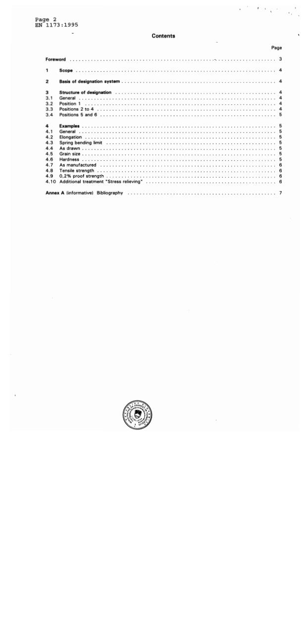EN 1173:1995 is a standard published by the European Committee for Standardization (CEN). Its full title is "Copper and copper alloys - Material condition or temper designation". This standard covers: This European Standard establishes a system for designation of material conditions or tempers to be used for the identification of the mandatory property requirements. These designations are applicable to wrought and cast products of copper and copper alloys, except ingots.