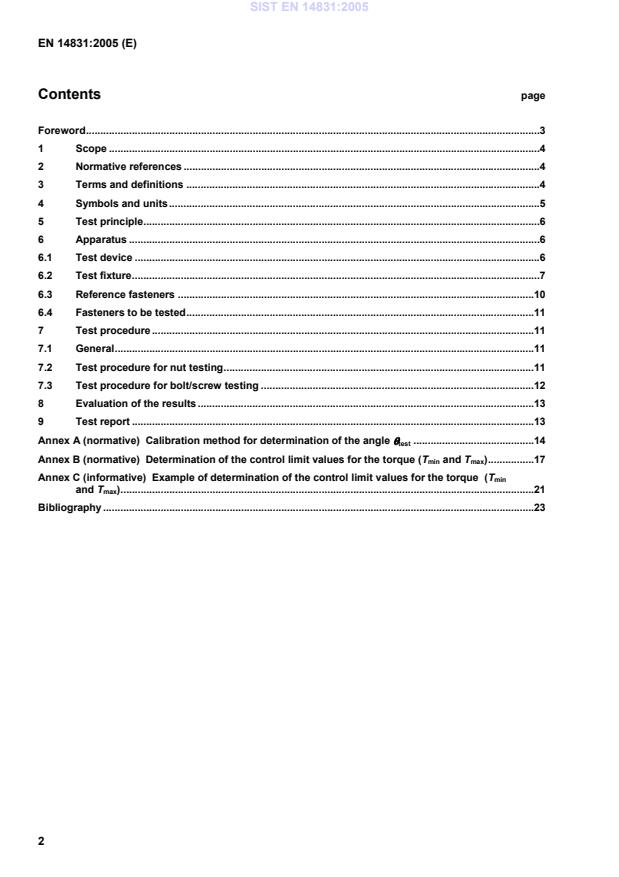EN 14831:2005 is a standard published by the European Committee for Standardization (CEN). Its full title is "Fasteners - Tightening performance - Torque/Angle simplified test method". This standard covers: This European standard specifies a test method for fasteners with ISO metric thread from M6 to M16 and with property classes 8.8 to 12.9 for bolts and screws and with property classes 8 to 12 for nuts, to check their tightening performance in the elastic range. It applies to steel fasteners with an ISO metric thread according to ISO 68-1. It applies to fasteners having a friction coefficient from 0,06 up to and including 0,18. For higher values of friction coefficients, the dispersion of test results increases and the test method should not be applied. For lower values friction of coefficients, which are for very specific applications and require special lubrication, this standard does not apply. This comparative test method can be used to monitor stability of a production process (such as coating, lubrication, shot-blasting) or to compare various production manufacturing lots. It can also be used to detect fasteners, which are out of specification. NOTE This simplified test method has been developed to avoid systematic use of more complex procedures. In case of dispute the torque/tension test method according to EN ISO 16047 is the referee test. This standard does not apply for assessment of fasteners in actual assembly conditions; it does not allow the measurement of operating friction coefficients.