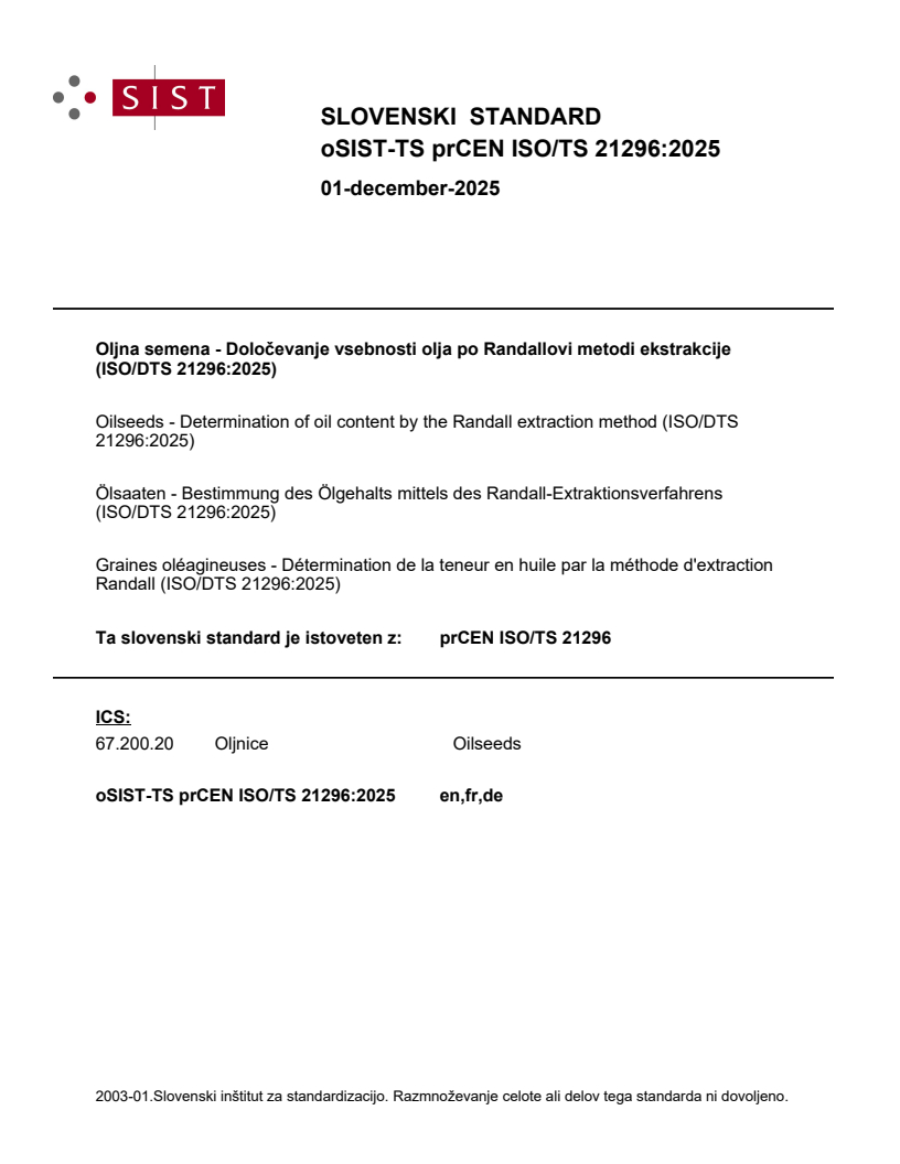 Semena oljnic - Določanje vsebnosti olja po Randallovi metodi ekstrakcije (ISO/DTS 21296:2025)